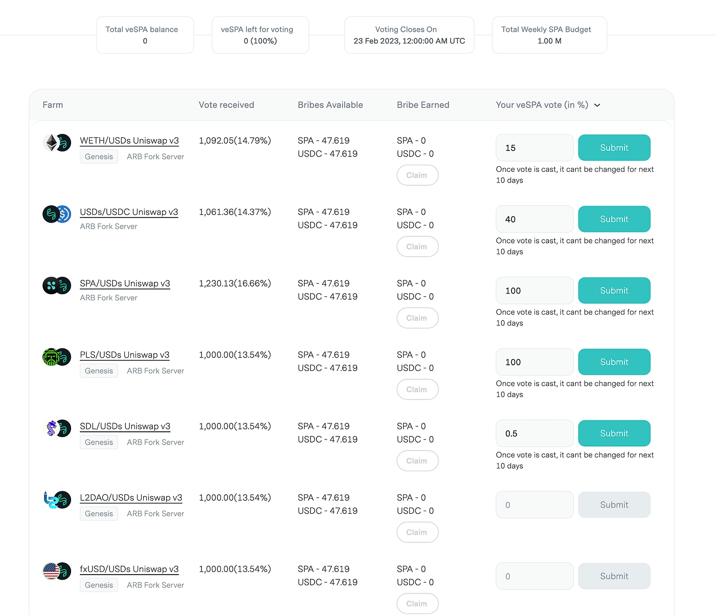 • Bribe Revenue: veSPA holders (SPA stakers) benefit from a new source of yield: bribes. If they wish to collect yield in SPA, bribe primary pools. For yield in other assets, bribe alternative pools.